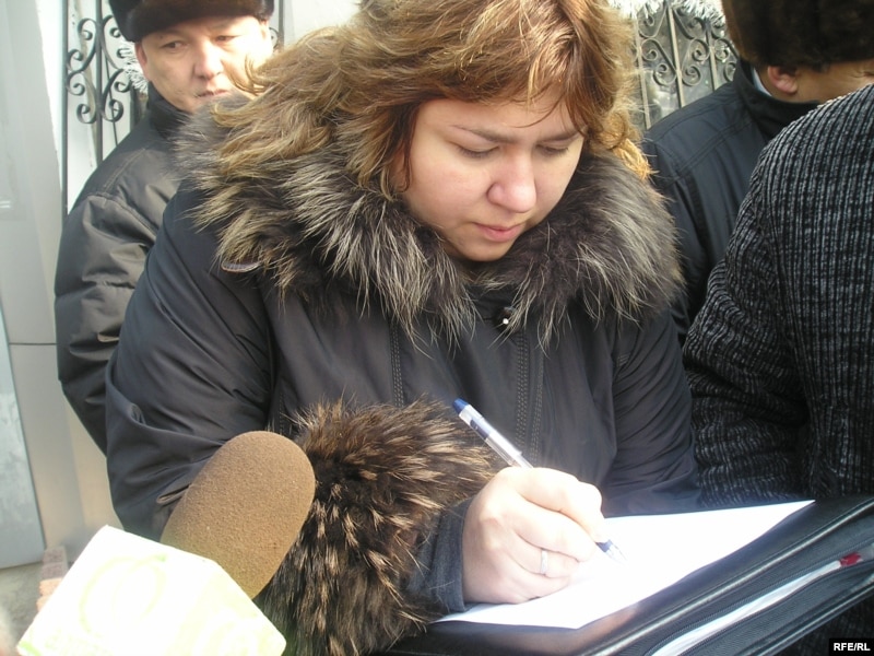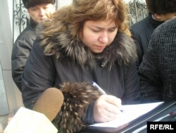 Жительница Алматы Оксана Григориади подписывает уведомление судебного исполнителя об отъеме жилья и земельного участка. Алматы, 15 февраля 2010 года.