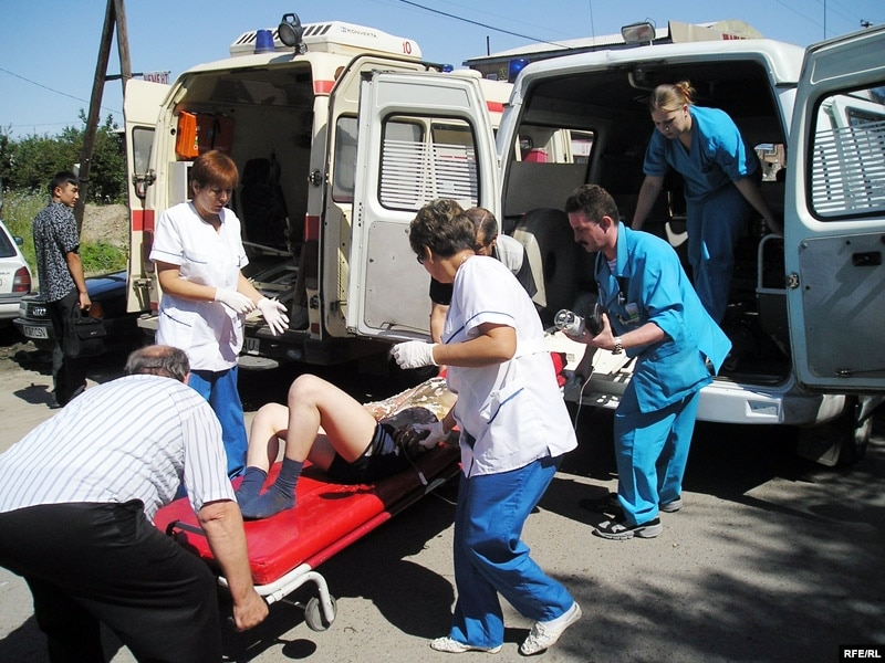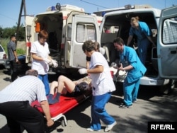 Сожженого офицера полиции Асета Бейсенова загружают в машину скорой помощи. Шанырак, 14 июля 2006 года.