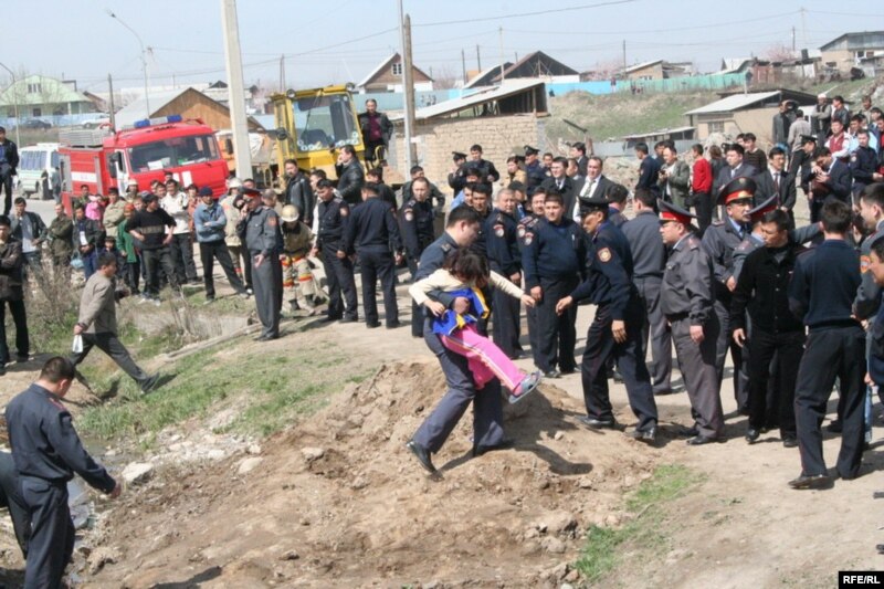 Полицейский несет Гульшат, дочь Корлан Даубаевой, рядом с которой взорвалась бутылка с бензином. Шынарак, 5 апреля 2006 года.