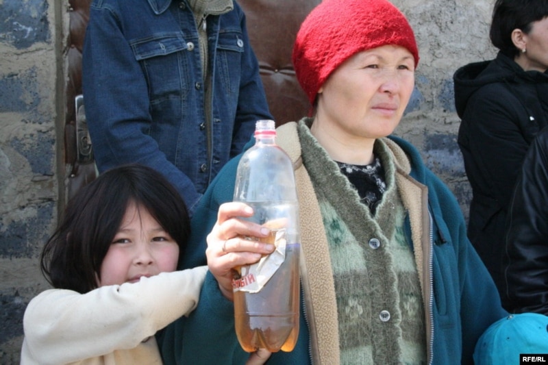 Корлан Даубаева держит в руках бутылку с бензином, рядом ее дочь Гульшат. Шынарак, 5 апреля 2006 года.