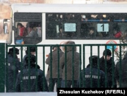 Кордон полицейских регулирует посадку болельщиков в автобус в день открытия Азиады. Астана, 5 февраля 2011 года.
