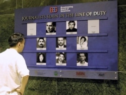 Мемориальный стенд с фотографиями погибших журналистов. Вашингтон, 16 июля 2008 года.