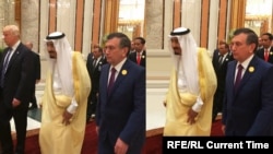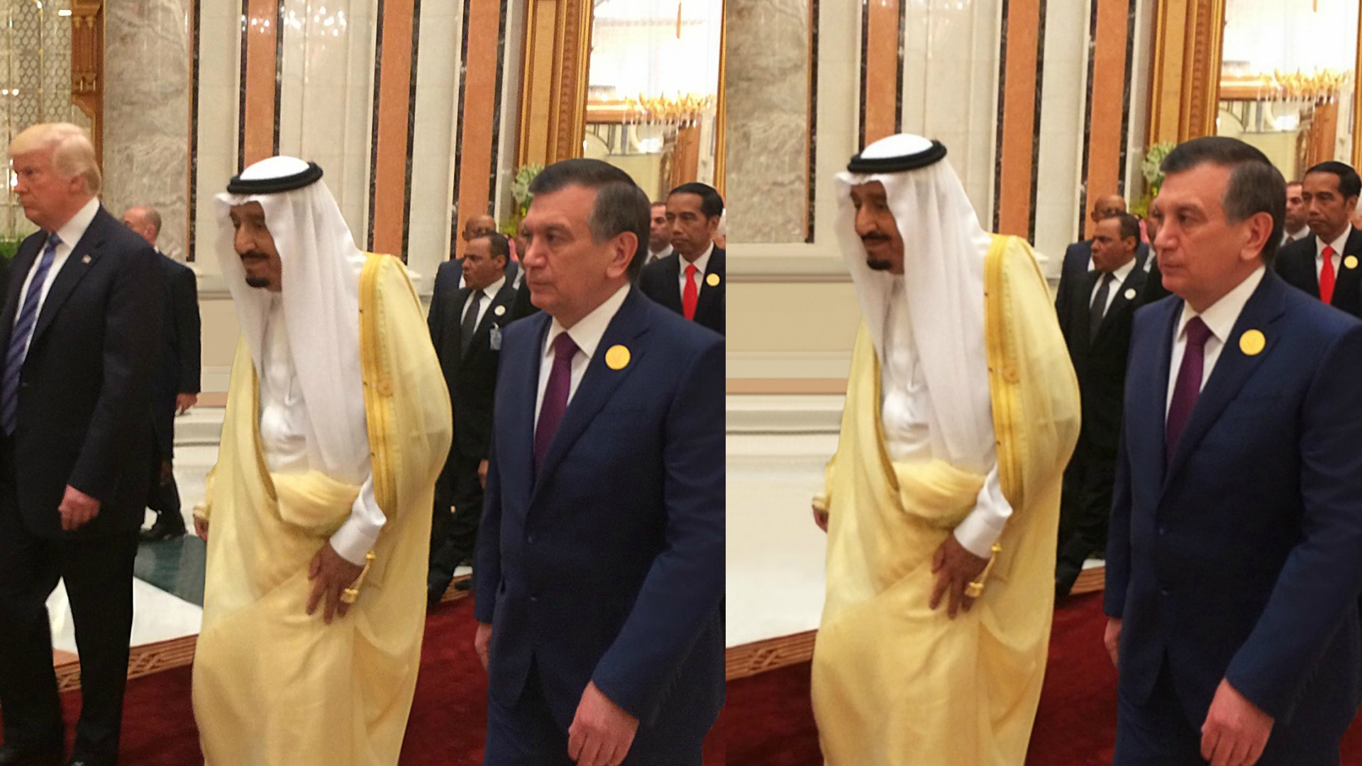 На другой 59-летний Мирзияев идет рядом с королем Саудовской Аравии Салманом бин Абдулазизом Ол Саудом. Справа – вариант УзА, слева – оригинал.