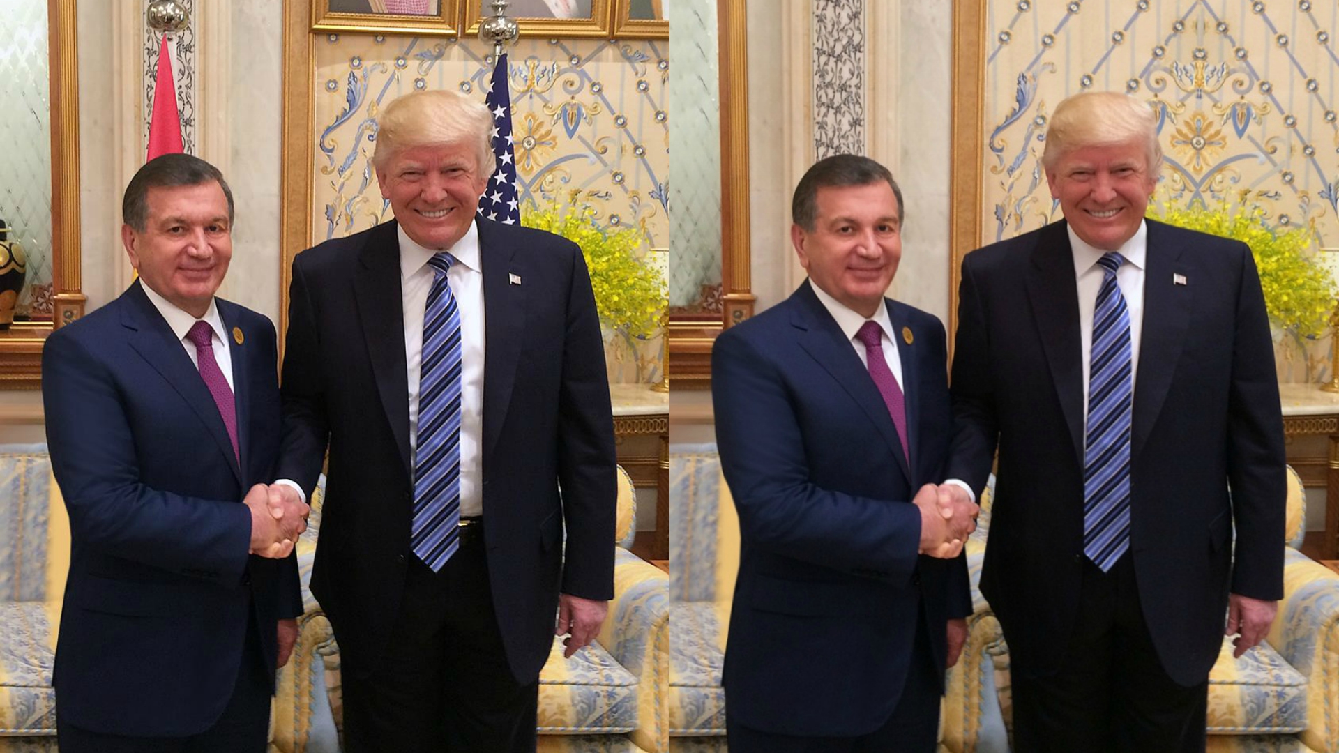 На одной из этих фотографий глава Узбекистана пожимает руку президенту США Дональду Трампу. Это их первая официальная встреча. Справа – фото, опубликованное на сайте УзА, слева – его оригинал.