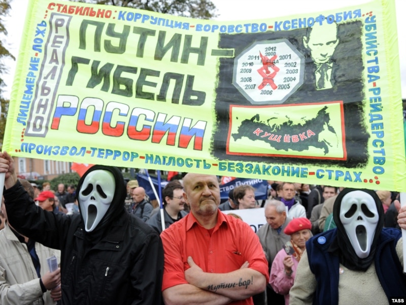 Участники антипутиновского протеста держат плакат с надписью "Путин - гибель России". Москва, 25 сентября 2011 года.